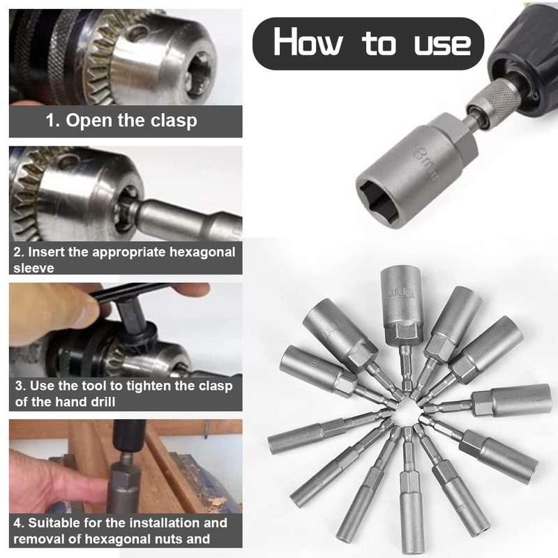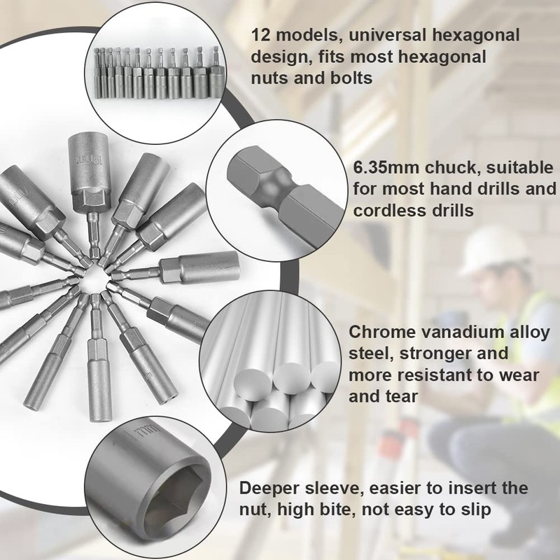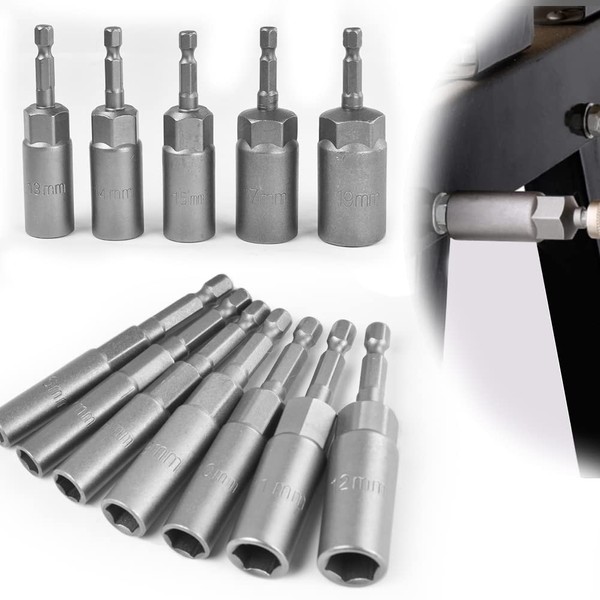 • 【12 Pcs Deepened Hexagonal Sockets】: The package contains 12 Magnetic Nut Setter of different sizes, namely 6mm, 7mm, 8mm, 9mm, 10mm, 11mm, 12mm, 13mm, 14mm, 15mm, 17mm, 19mm, enough for your use On demand. They are silver in color and 80mm long to fit most corded and cordless drills.