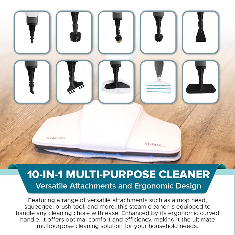 - VERSATILE STEAM CLEANER - The Supra Pro 10-in-1 is your versatile cleaning powerhouse. Easily switch between its steam mop mode for floors, including tiles, grouts, hardwood, and laminates, and handheld mode for refreshing upholstery, drapes, or curtains C it's your ultimate home cleaning solution!