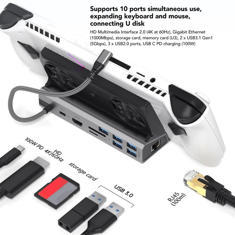 Steam Deck and ROG Ally Docking Station, 10-in-1 Steam Deck Dock with HDMI 2.0 4K@60Hz, Gigabit Ethernet, 2 x USB 3.1, 3 x USB 2.0, 100W USB-C PD Charging Port, Dual Fans