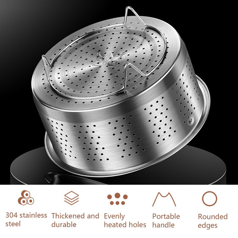 - High base design: stainless steel steamer with two feet on the bottom, convenient for heating or as a rice cooker, soup pot, pressure cooker, etc. With handle, easy to reach.