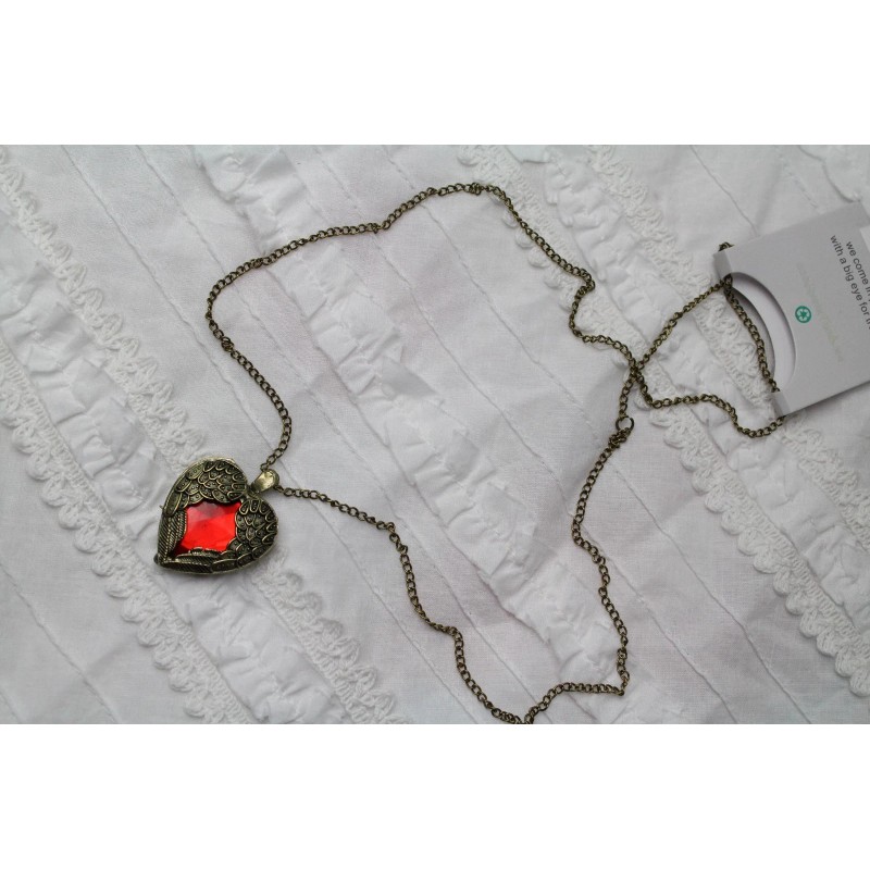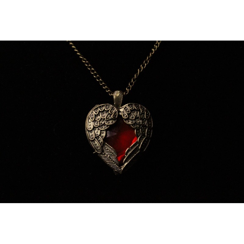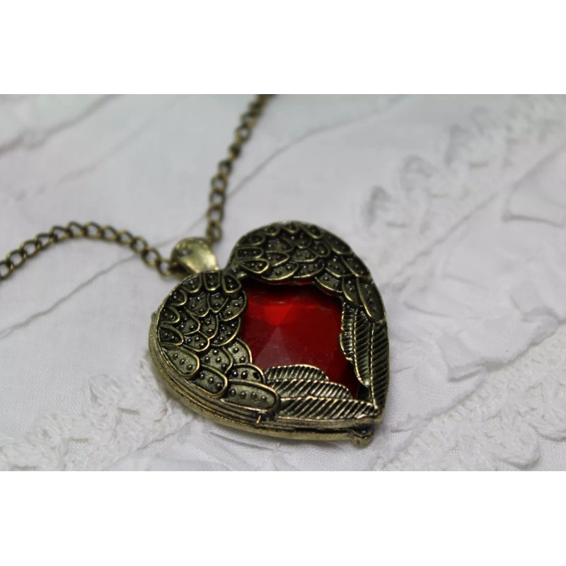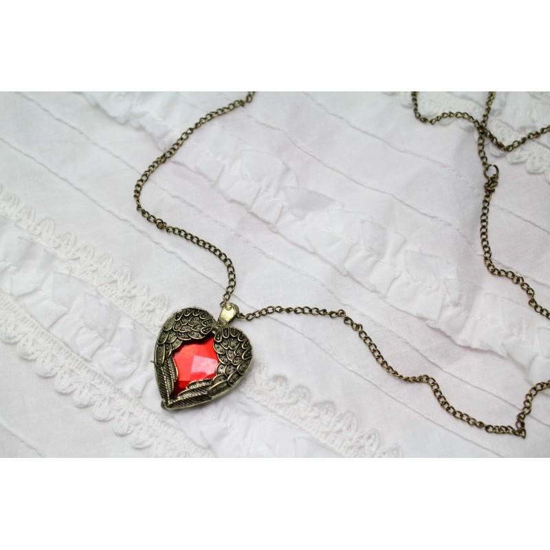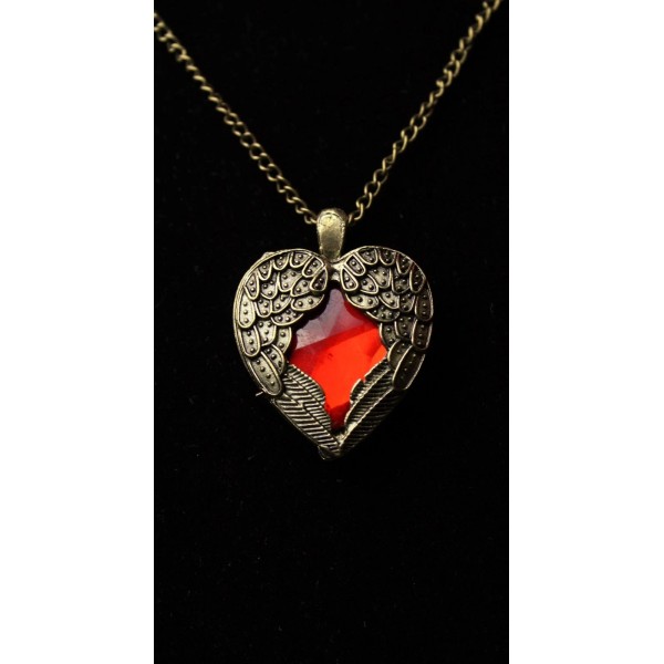 Steampunk Golden Winged Ruby Crystal Heart Pendant on 24" Chain Necklace