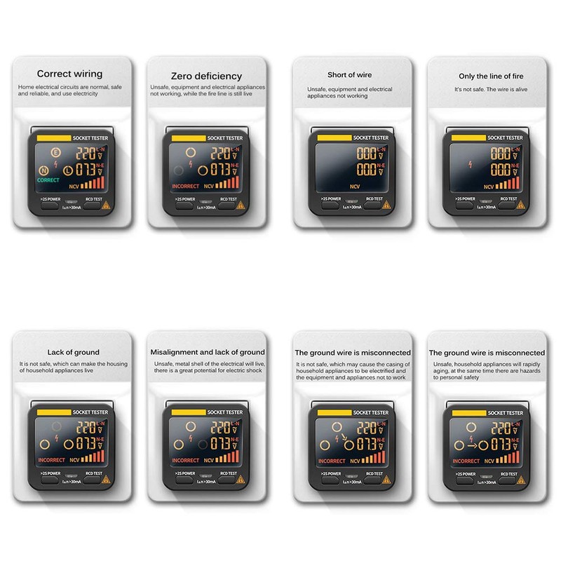 Mit unserem Steckdosentester können Sie einfach die Spannung, die Polarität, das Vorhandensein von Erde überprüfen und sogar den RCD testen. Er erkennt 8 verschiedene Verdrahtungsbedingungen, sodass Sie Probleme genau identifizieren können. Egal, ob Sie eine Privatperson oder ein Profi sind, dieses unverzichtbare Werkzeug hilft Ihnen, Stromunfälle zu verhindern und die Sicherheit Ihrer Umgebung zu gewährleisten.