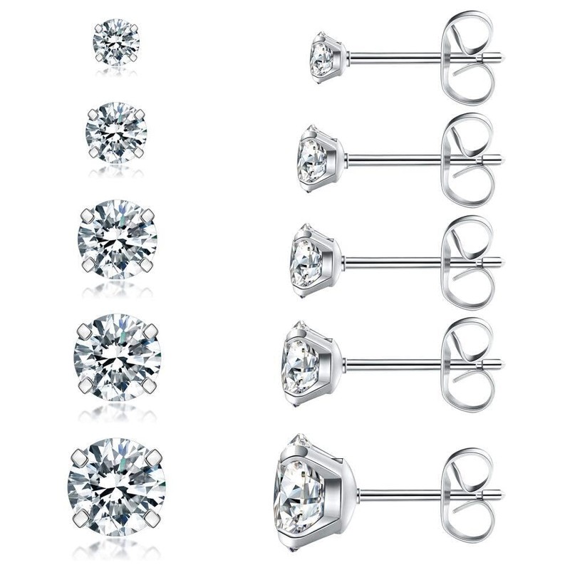 Steel Color, 5 Pairs Stud Earrings Set, 316L Stainless Steel 3-7mm Hypoallergenic Cubic Zirconia
