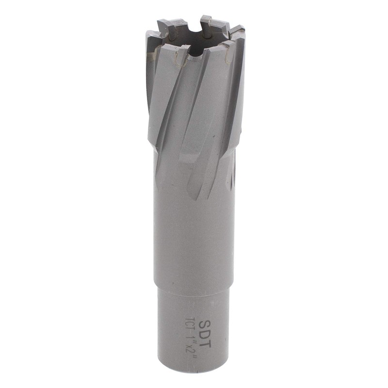 The Steel Dragon Tools 1-inch carbide-tipped annular cutter. This bit will quickly and safely cut holes in steel. This bit has a 2-inch cutting depth with a 3/4 in. Weldon shank.
