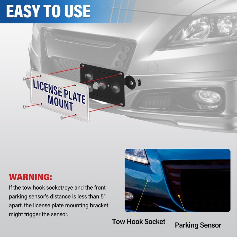 - No-Drill Easy Installation - Equipped with 4 adjustable mounting points, allowing car owners to customize the license plate position freely to avoid blocking vehicle air intakes, headlights, or parking sensors. No drilling or vehicle modification is required, and secure installation can be completed in minutes, catering to car owners' need for convenient installation.