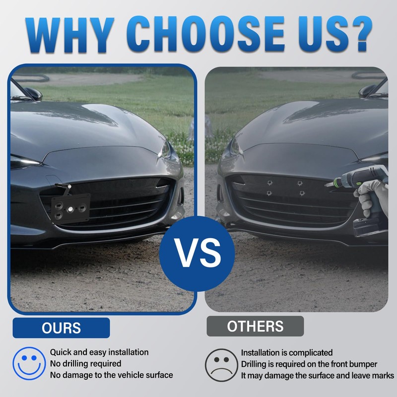 • No-Drill Easy Installation - Equipped with 4 adjustable mounting points, allowing car owners to customize the license plate position freely to avoid blocking vehicle air intakes, headlights, or parking sensors. No drilling or vehicle modification is required, and secure installation can be completed in minutes, catering to car owners' need for convenient installation.
