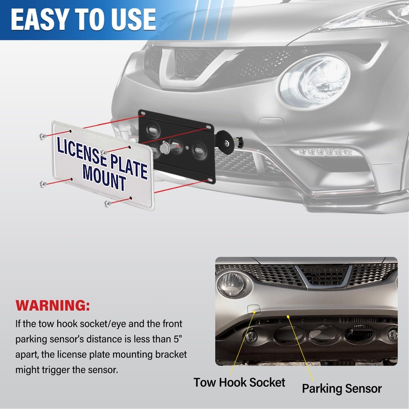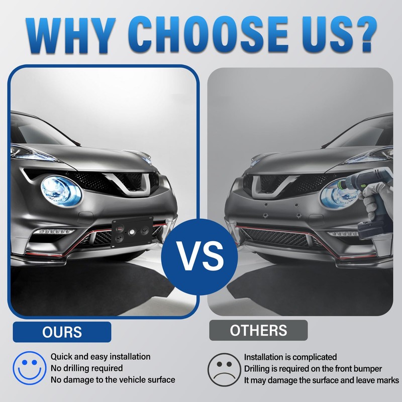 - No-Drill Easy Installation - Equipped with 4 adjustable mounting points, allowing car owners to customize the license plate position freely to avoid blocking vehicle air intakes, headlights, or parking sensors. No drilling or vehicle modification is required, and secure installation can be completed in minutes, catering to car owners' need for convenient installation.