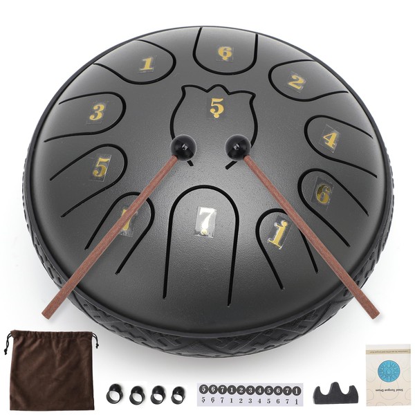 - 11 DIFFERENT TONES: Steel drums have 11 different tones for a wider range and more musical options. You can hit the steel drum with your fingers or drumsticks, the included note stickers make it easier for beginners to get started and play, and the accessory also includes a convenient carrying bag to start your musical journey wherever you are.