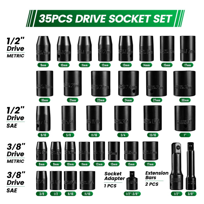 - 【SIZE OF SOCKET SET】 Set included: 20pcs 1/2" drive shallow sockets - SAE: 9/16'',5/8'',11/16'',3/4'',13/16'',1'' - Metric: 9, 10, 11, 12, 13, 14, 15, 17, 18, 21, 22, 24, 27, 30mm; 12pcs 3/8" drive shallow sockets - SAE: 3/8'',1/2'',9/16'',11/16'' - Metric: 8, 9, 10, 11, 12, 13, 15, 17mm; 2pcs 3” extension bars: 1/2”dr, 3/8”dr; 1pc socket adapter: 1/2"F to 3/8"M.