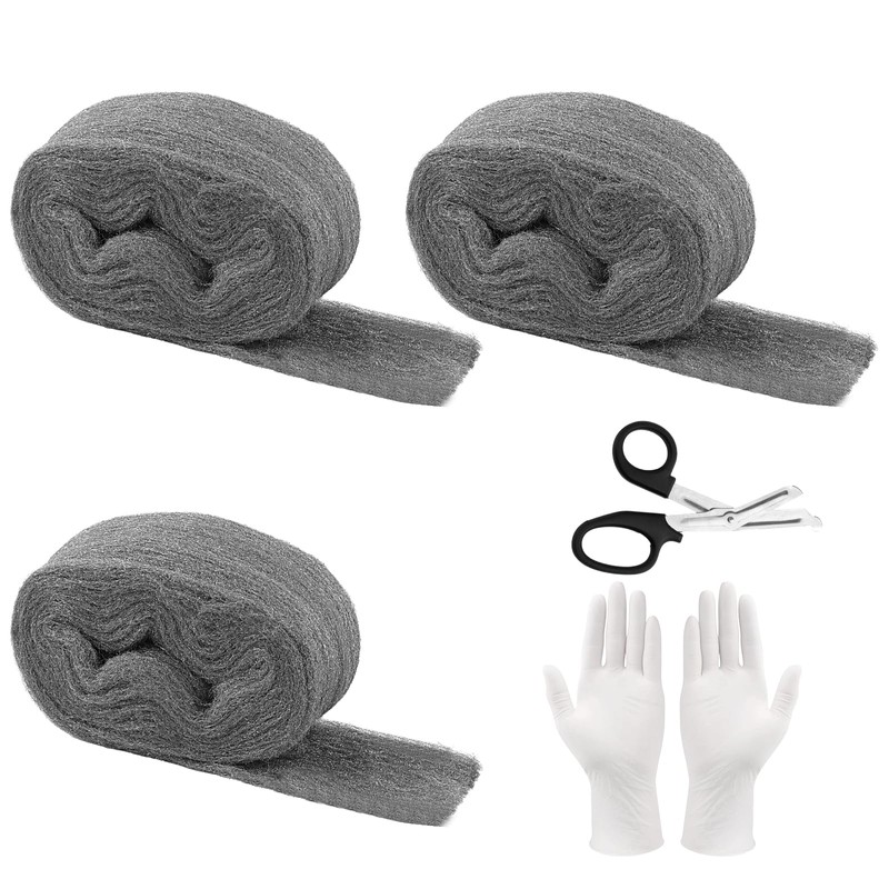 - Steel wool set: includes 3 rolls of steel wool 0000, 3.5 meters/roll, 1 pair of work gloves and 1 scissors. Note: keep steel wool away from children, pets. Regularly check areas filled with steel wool and replace damaged steel wool