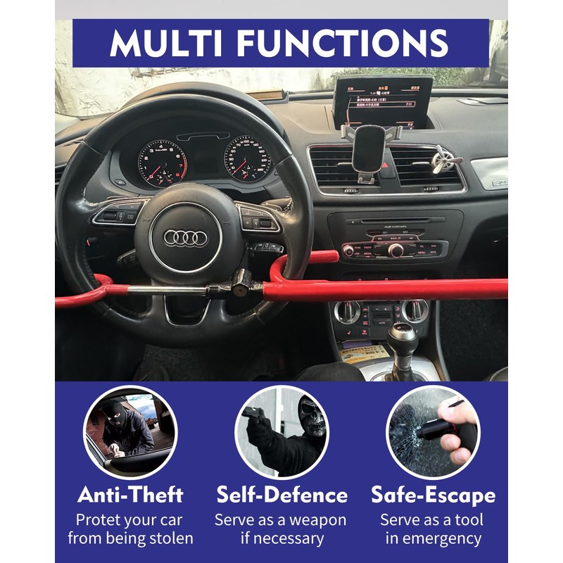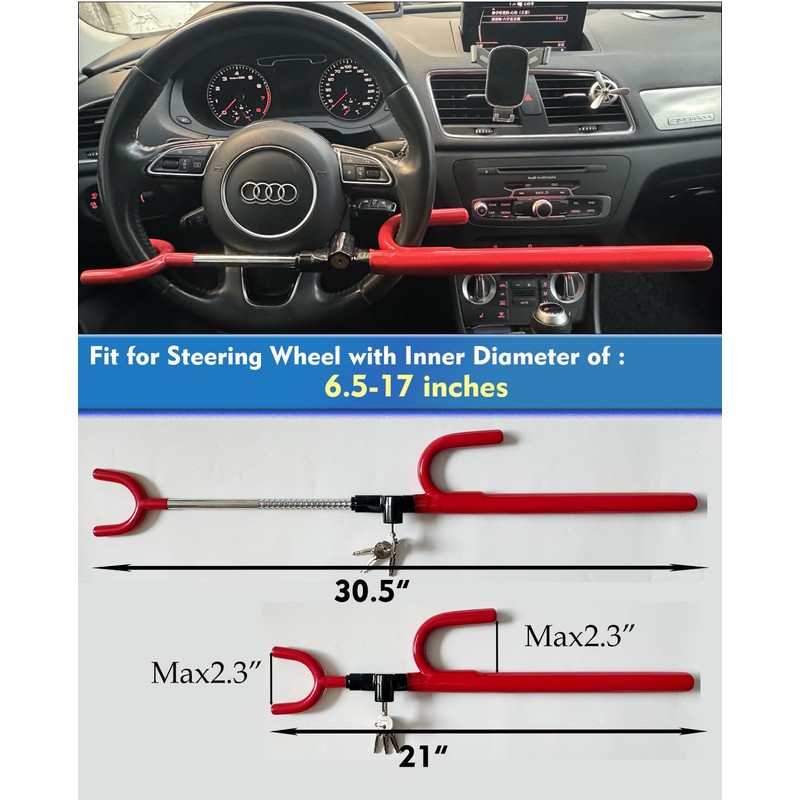 - Adjustable steering wheel lock :The steering wheel lock come withs 2 keys which is unique. Key design is almost impossible to duplicate.