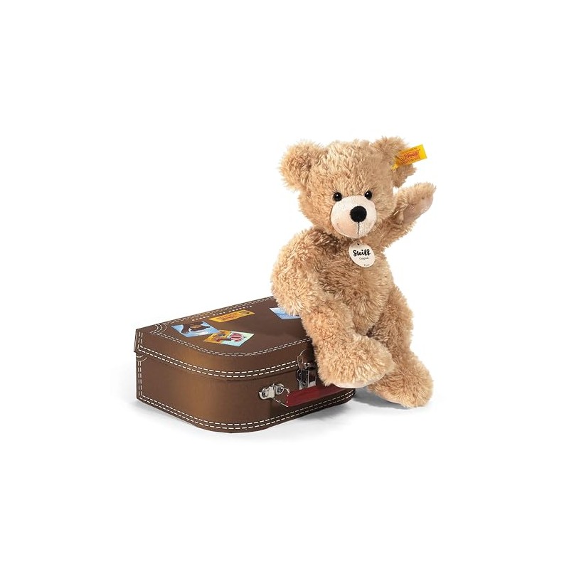 Our Fynn teddy bear is the ultimate traveling companion for every child. He's handmade from super-cuddly plush and comes in his own sturdy suitcase -- complete with vintage-style travel graphics. Your little one will want to take him everywhere. Machine washable (without suitcase). from Steiff, The legendary Company that invented the teddy bear. Featuring the famous “button in ear” trademark, Symbol of highest quality and safety.