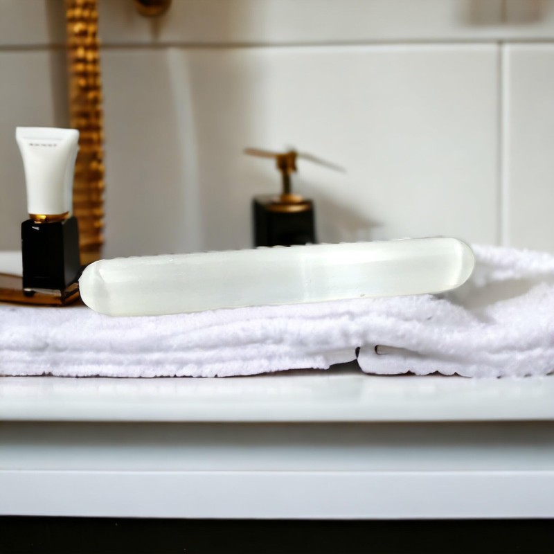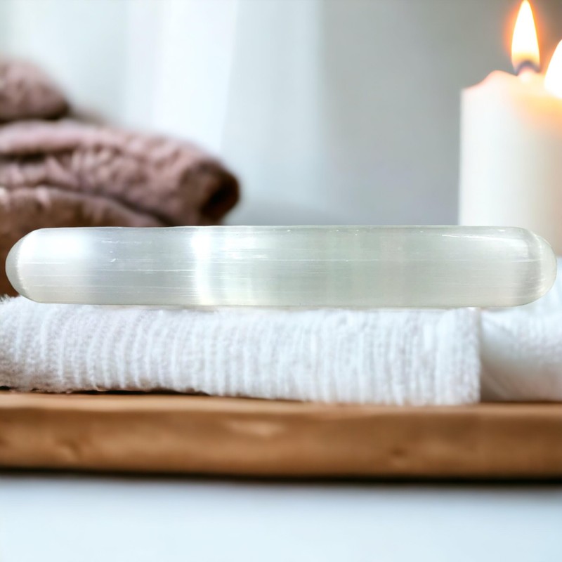 - A solid, beautiful, hand-carved white selenite massage stick with round tips 150 mm long, 25 mm wide, 25 mm high with a weight of approx. 120 g