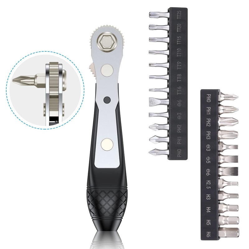 - Dual-Purpose Ratchet Wrench: The ratchet wrench (4.3" long) is assembled with a 36-tooth reversible ratchet system to ensure smooth ratcheting in both directions. High-quality teeth provide high torque and precise adjustment compared to 12-teeth or 16-teeth ratchet. Simply flip the button to change direction for tightening or loosening the screws. Bit holders on the head and bottom of the wrench are strongly magnetized for holding bits.