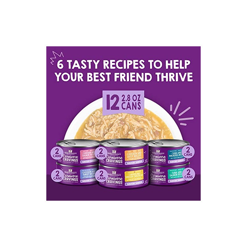 12-can variety pack featuring 6 delicious recipes of shredded muscle meat slowly simmered in a savory high-moisture broth to deliver a special meal even the finickiest of cats will love! Give your cat the taste and texture they naturally crave with the protein-rich nutrition of Stella & Chewy's Carnivore Cravings Savory Shreds.