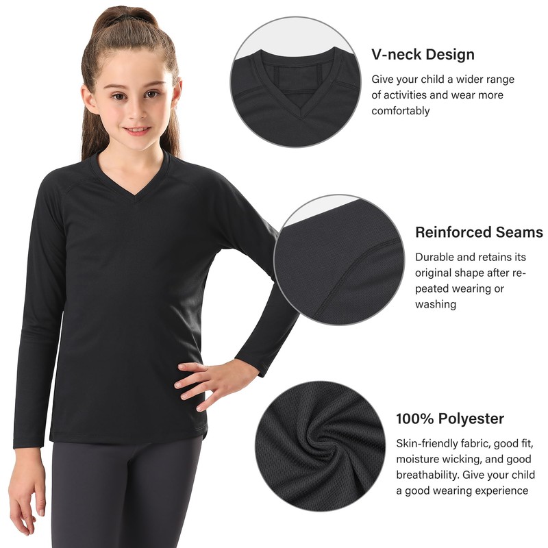 Stelle Youth Girls Athletic Performance Long Sleeve Shirts V Neck Moisture Wicking Base Layer Undershirt(Black+White,M)