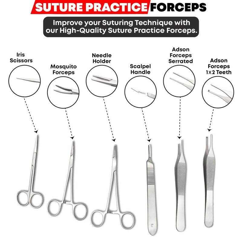 - 38 PCS SUTURE PRACTICE KIT – Our suture kit medical instruments and supplies essential for wound closure and surgical procedures training. It includes Mosquito Forceps Curved, Hegar Needle Holder 14cm, Adson Forceps Serrated, Iris Scissors Straight 11cm, Scalpel Handle No.3, Adson Forceps 1x2 Teeth, Suture Pad for suture practice, 20 pcs Mix Suture thread for various wound closures, and 5x each Blade 10# & 11# for precise surgical cutting needs. Our medical grade suture kit serves as an indispensable component of medical students.