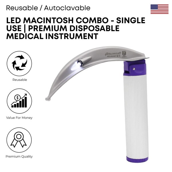 Enhance procedural efficiency and safety with the LED Macintosh Combo – Single Use, specifically designed for medium adult use. Manufactured by Stellmacher Instruments Inc, this premium-quality disposable anesthesia instrument is made from high-grade stainless steel and comes preloaded with batteries for immediate use. The handle and blade are permanently attached to ensure stability and simplify single-use protocols.