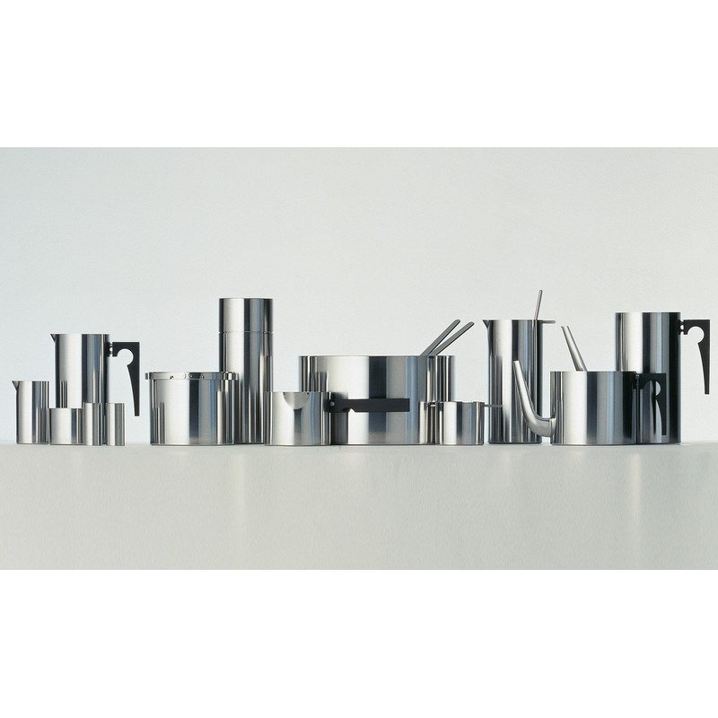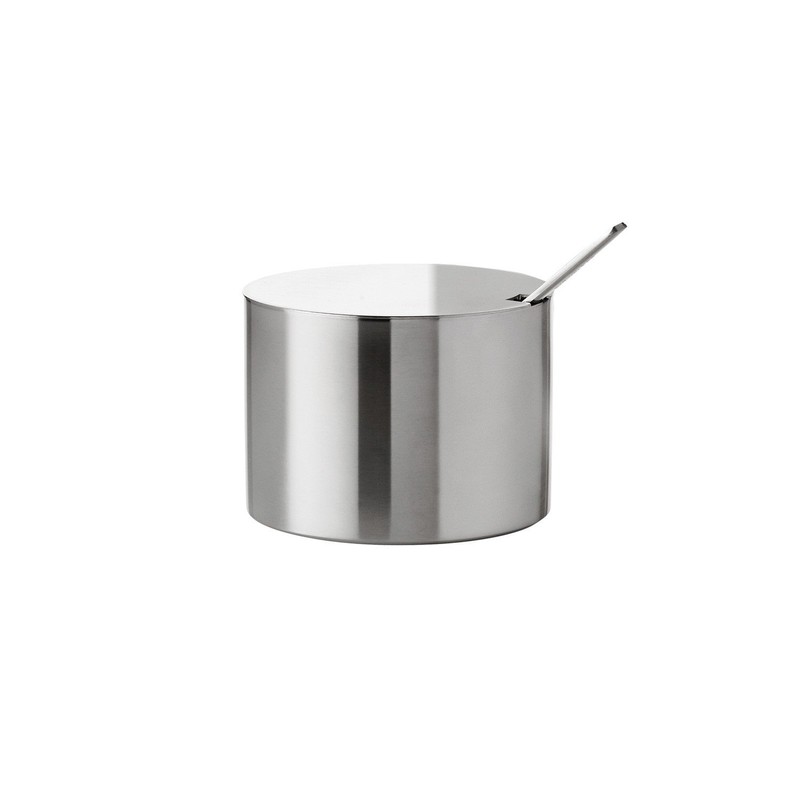 This AJ Sugar Bowl is one of the first designs in the cylinderline series designed by Arne Jacobsen. Simple cylindrical design, no seams on the sides and bottom, and uncompromising attention to detail. Lid keeps dust and dirt out of the sugar inside. The teaspoons are cut to allow the lid to be kept in place and ready to hang on the shelf after use.
