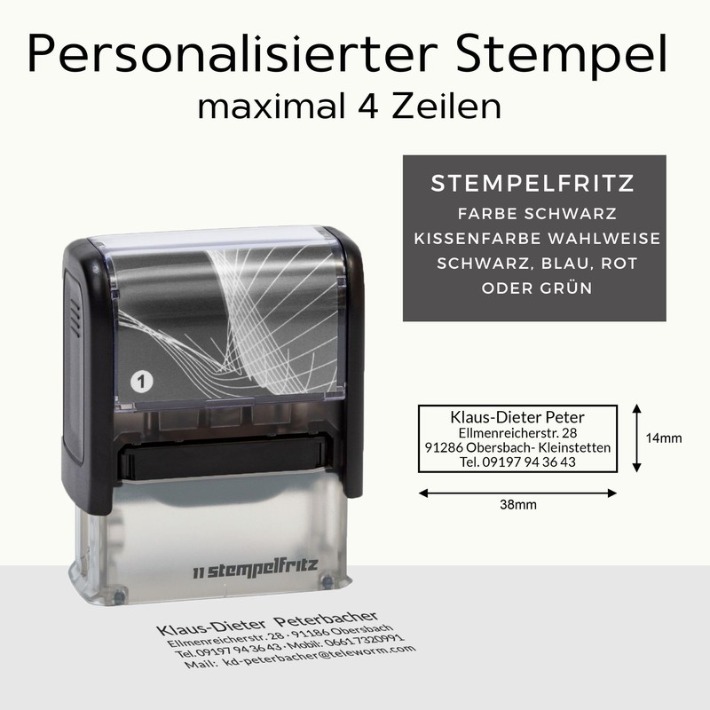 stempelfritz stempelfritz Personalisierter Adressstempel – Selbstfärbend, Abdruck 38x14 mm, bis zu 4 Zeilen, Gr. 1
