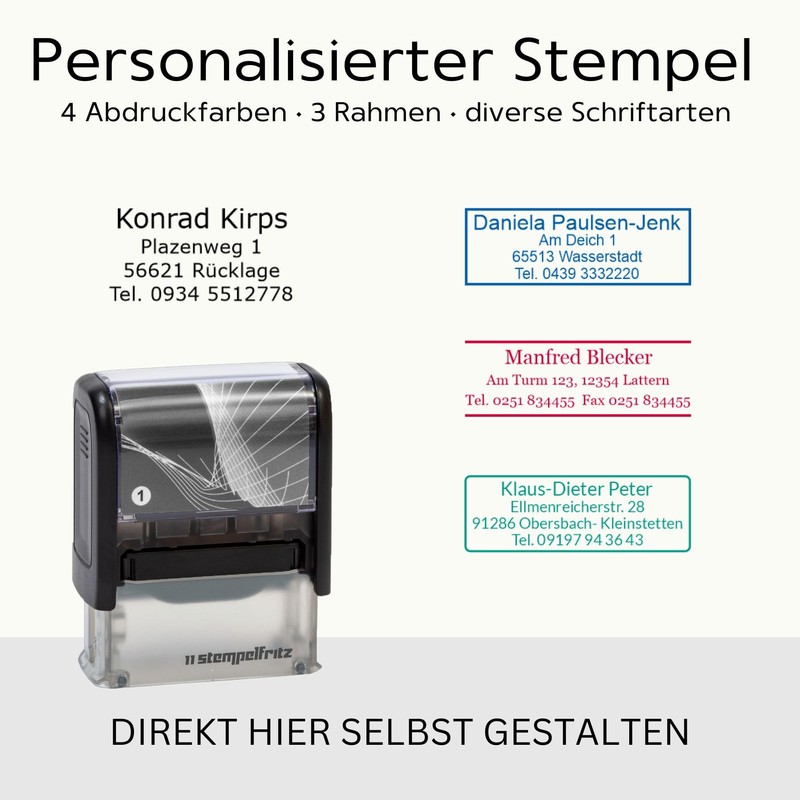 - Ob als Adressstempel, Namensstempel oder Firmenstempel, gestalten Sie sich selbst je nach Bedarf ihren eigenen Stempel inkl. Namen, Adresse, Telefon, Mobilnummer, E-Mail, Steuernummer, Bankverbindung uvm.