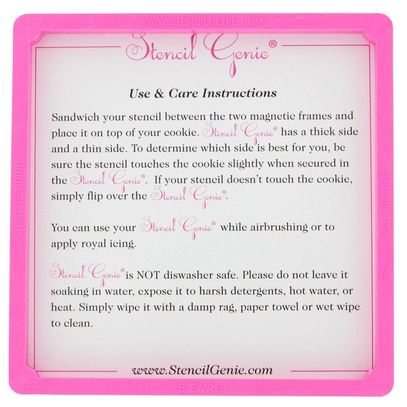 La Stencil Genie tiene un marco elegante y fácil de limpiar con un calcomanía muy fuerte para sujetar los imanes mejor que nunca. Con esquinas redondeadas suaves y una unión magnética más fuerte, este es el mejor genio de plantillas hasta ahora. Moldeado por inyección, producido comercialmente en los Estados Unidos. El juego incluye: 1 cuadrado de 14 cm, marco de dos piezas, con un lado de 1/4 pulgadas de grosor y un lado de 3/8 pulgadas de grosor que los imanes de neodimio unidos ayudan a sujetar una plantilla de forma segura encima de tu galleta (patente estadounidense 10383350). El marco es solo lavado a mano. Solo un enjuague ligero o límpielo con una toalla húmeda lo limpiará de inmediato