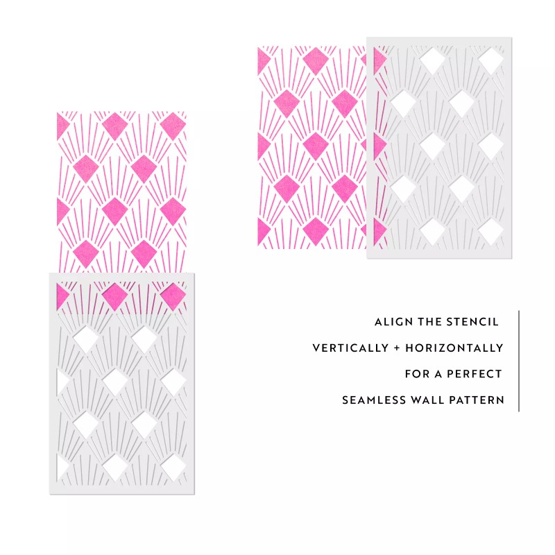 And if you're thinking using the stencil would be too hard, think again. The stencil is designed with registration marks, so you can get the alignment and spacing perfect every time you shift it. Plus, it's big enough to cover a large area at one time. Honestly, when you use the metropolis flare pattern wall stencil, you will literally feel like you are walking into a whole new room. Plus, people will think you hired a professional to do it.