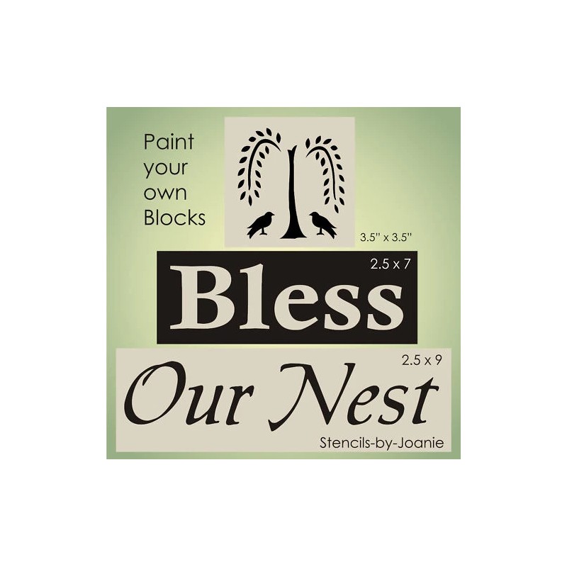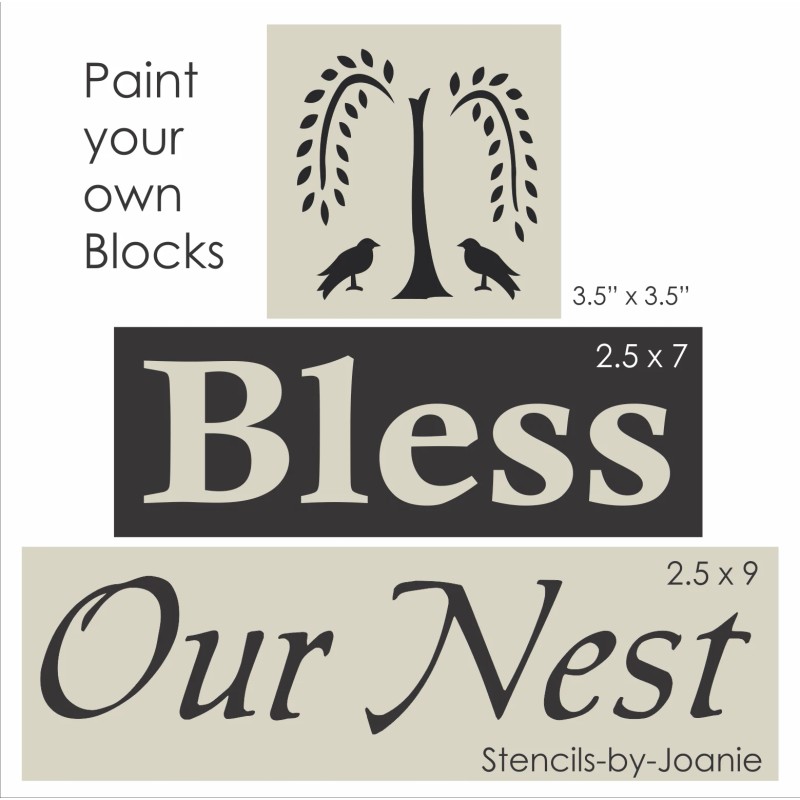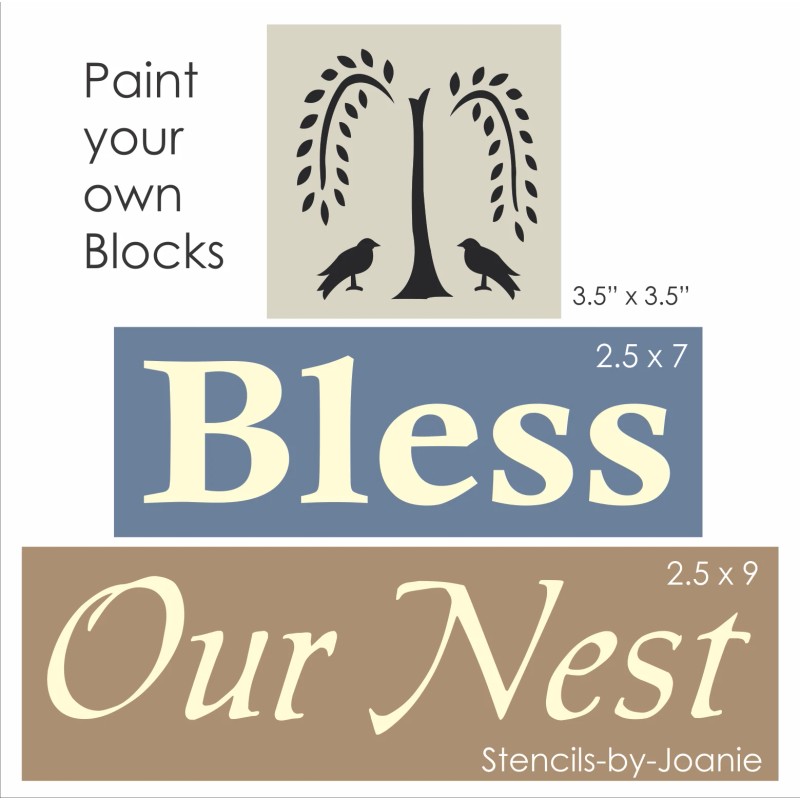 (1) New Stencil Trio #T105 ~ Bless Our Nest with Primitive Willow Tree and Crow topper design - paint your own Country family home decor and popular shelf sitter blocks with reusable Stencils-by-Joanie