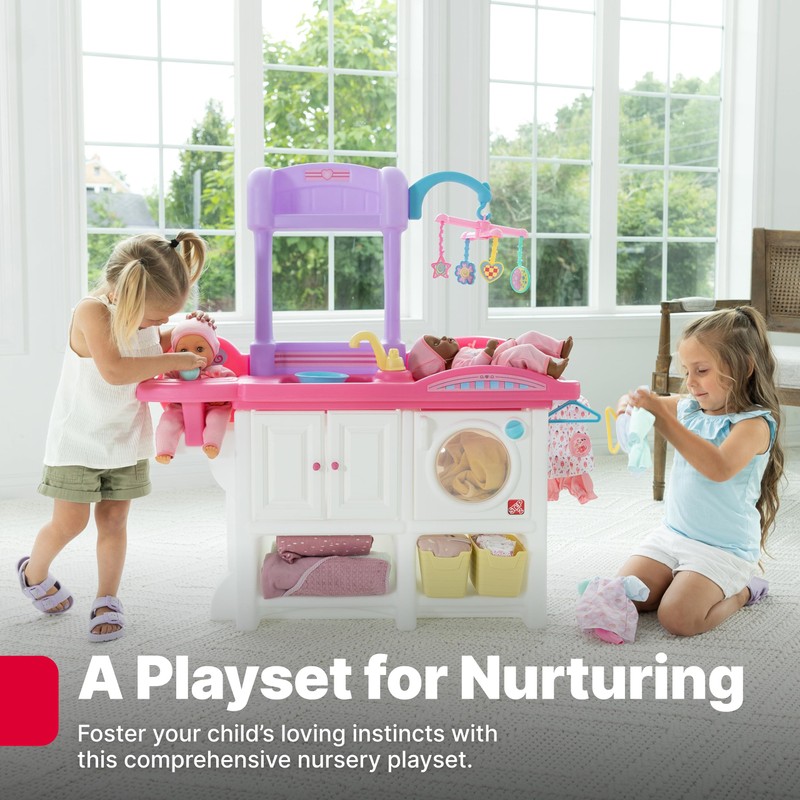 - Kids’ nursery Playset includes feeding station, molded-in sink, front-load washer, and rack to hang baby’s clothes.