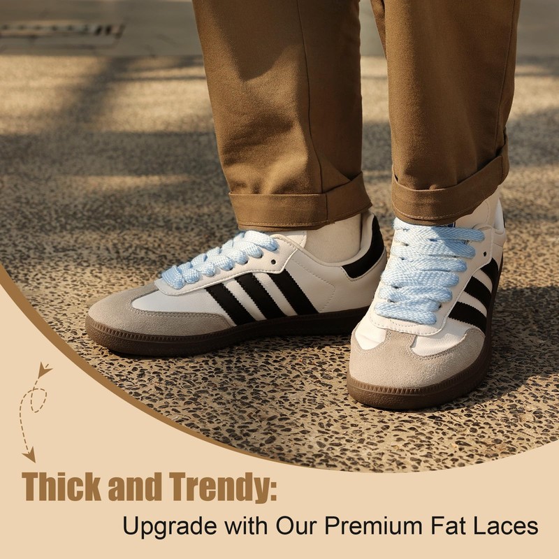 - Create your own style: 2 pairs (4 light blue shoelaces) flat double layer shoelaces made of harmless materials - polyester. The soft texture of the laces against your shoes brings a feeling of comfortable and soothing. The mercerisation gives the laces a subtle shine and gives your shoes a kind of inimitable style
