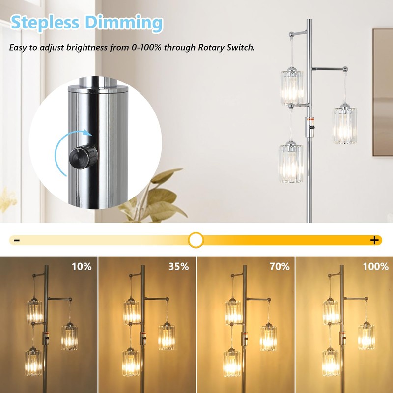 - 【Upgraded Stepless Dimmable Floor Lamp】Unlike the traditional non-dimmable floor lamps for living room, our crystal floor lamp is fully Stepless Dimmable. Just simply twist the dimmer and then you can adjust the standing lamp in the brightness range of 0 to 100% according to the needs of different scenes. Match for any indoor areas which including Living Room, Bedrooms, Dining room, Nursery, Office, Corridor, Basement, Sofa Corner and Reading Room.