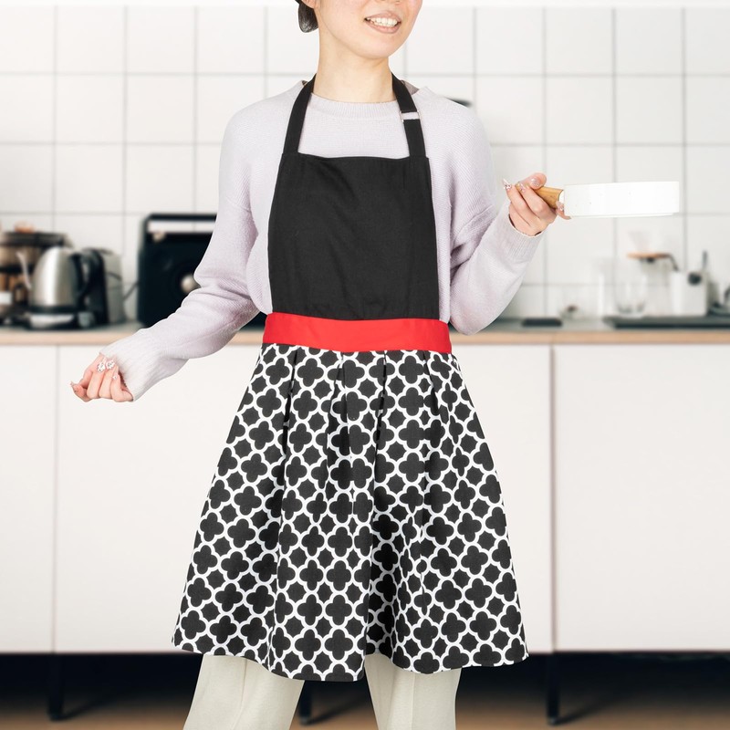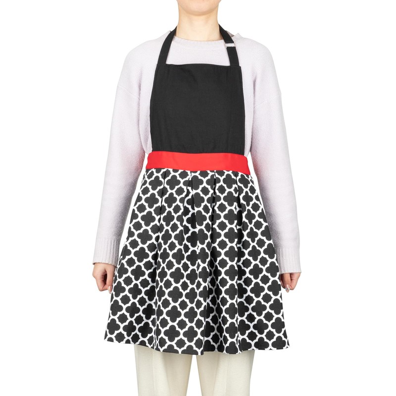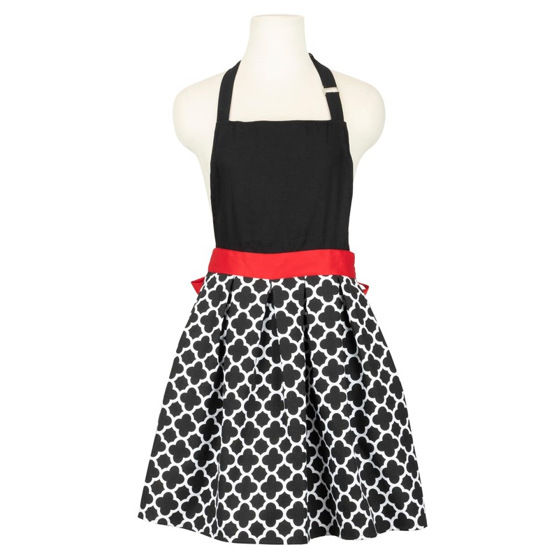 - The ultimate workwear apron in kid's size! Our take on the classic apron, this medium weight cotton apron has a black and white quatrefoil design that is complemented by bright red belt-like design. Brass metal grommets and 2 hidden side pockets complete the look of this apron.