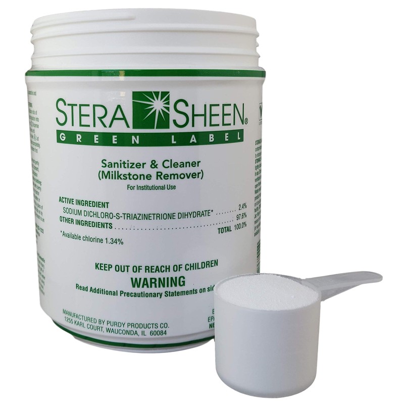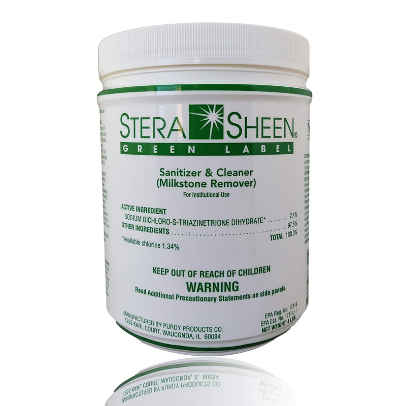 - Your order will contain selected pack quantity of 4 lb jars. Easy to follow instructions are provided on the packaging. Stera Sheen Green Label Sanitizer and Cleaner is an NSF listed and approved sanitizer Key Product Features