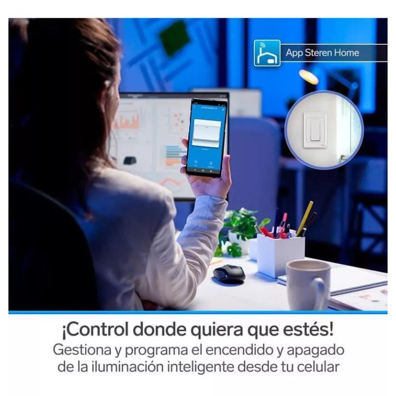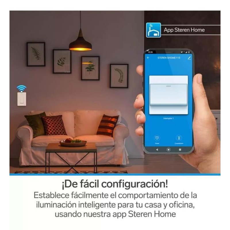 Se configura y maneja a través de la aplicación Steren Home, disponible para Android y iPhone.