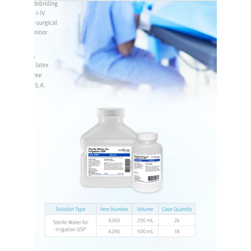 SteriCare Solutions Sterile Water for Irrigation is used for moistening absorbent wound dressings, debriding and cleaning acute and chronic dermal lesions, pressure ulcers, statis ulcers, diabetic ulcers, foot ulcers, post-surgical wounds, first and second degree burns, cuts, abrasions and minor skin irritations and for device irrigation.