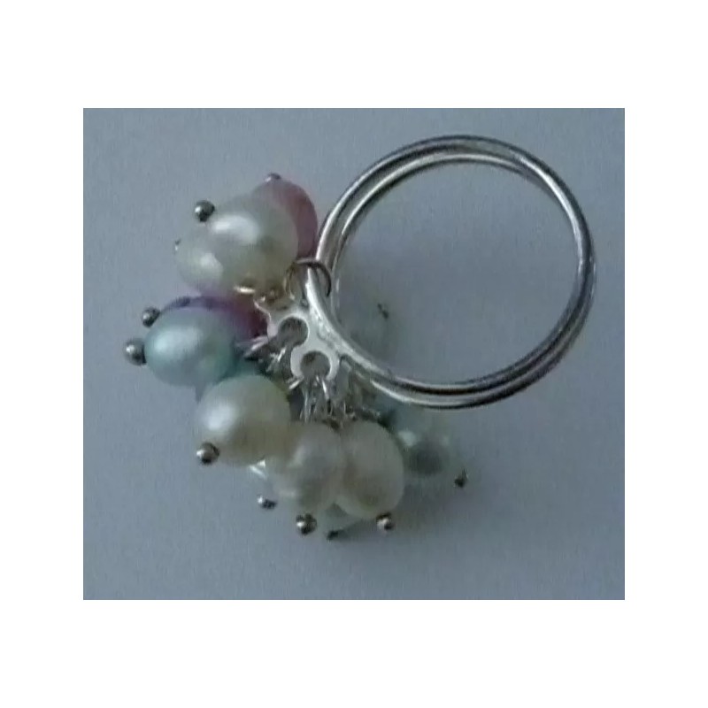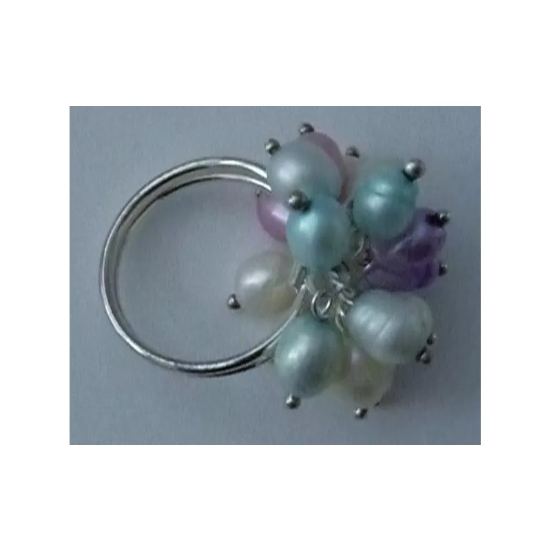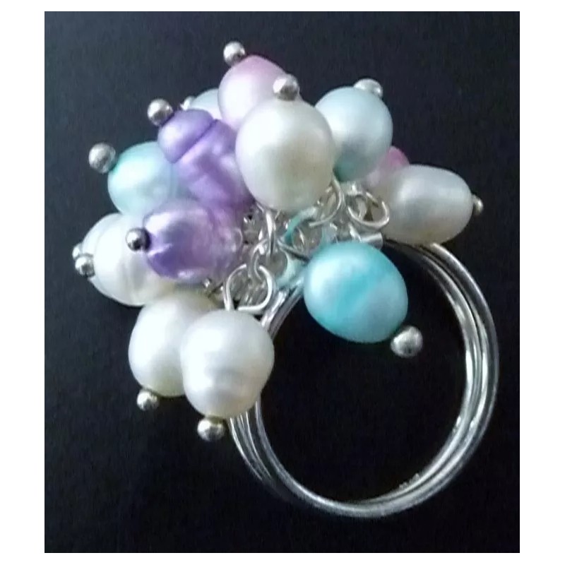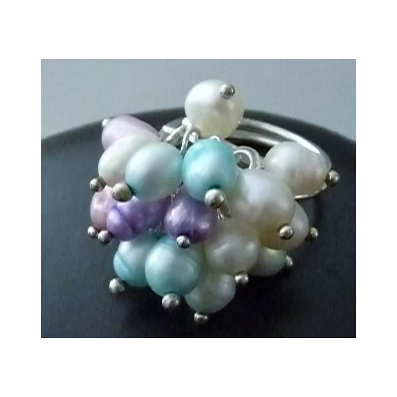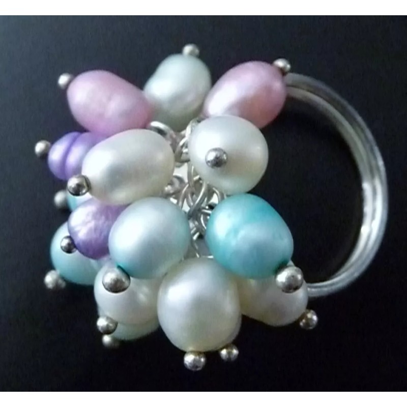 Pastel Multi Color Fresh Water Pearl Grape Cluster Silver Dangle Ring