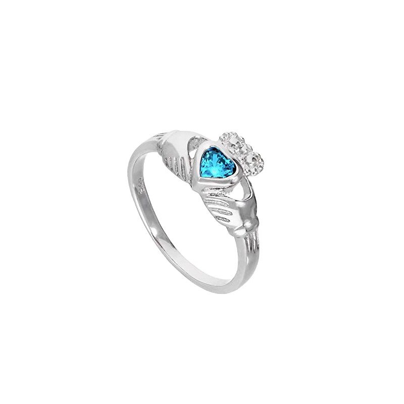 Sterling Silver & Aquamarine CZ Crystal March Birthstone Claddagh Ring Size U (Available I - U)