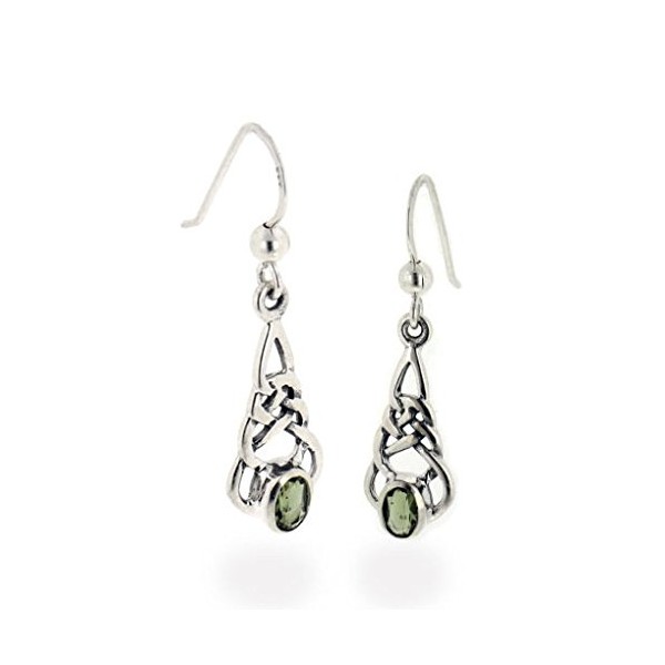 Intricate knotwork holds a genuine Moldavite gemstone. Fairly small, they are crafted of sterling silver with hooks for pierced ears. Moldavite is the product of a meteor collision with Earth nearly 15 million years ago. It fell over what is now called the Moldau River Valley in the Czech Republic. These green gems are among the most rare minerals on earth. In legend, it is believed Moldavite was the green stone in the Holy Grail, and has the power to quicken one's spiritual evolution.