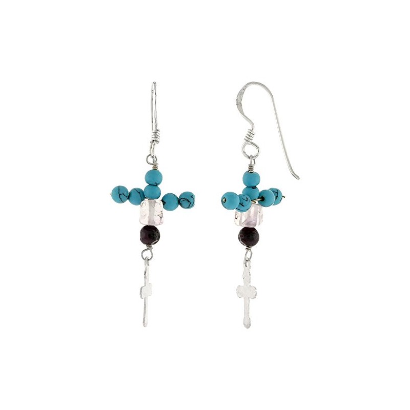 Sterling Silver Cross Earrings, Simulated Turquoise Beads & White Crystals, 1 7/8 inch tall