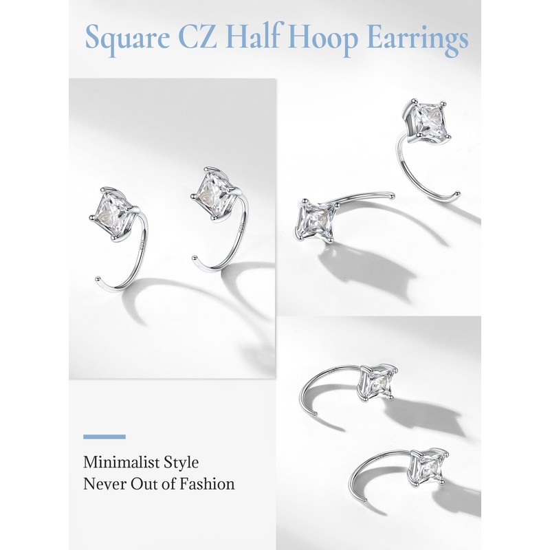 Sterling Silver CZ Half Hoop Earrings, Silver Open Stud Earrings for Women with Square Cubic Zirconia