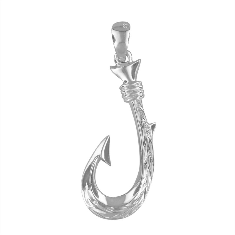 - Features: A reversible sterling silver fish hook pendant with hand engraved Hawaiian heirloom scroll detail. Enjoy two different looks with maile leaf design on one side, Hawaiian scroll design on the other. Picture shows two pendants for design reference only. You will receive one pendant with both designs on each side
