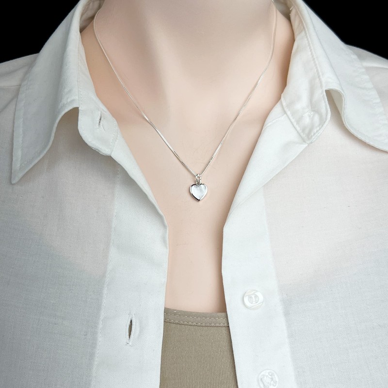 Crafted from high-quality sterling silver, this necklace features a delicate chain that gracefully holds a beautiful heart-shaped pendant. The pendant is adorned with a natural mother of pearl inlay, which radiates an iridescent luster.
