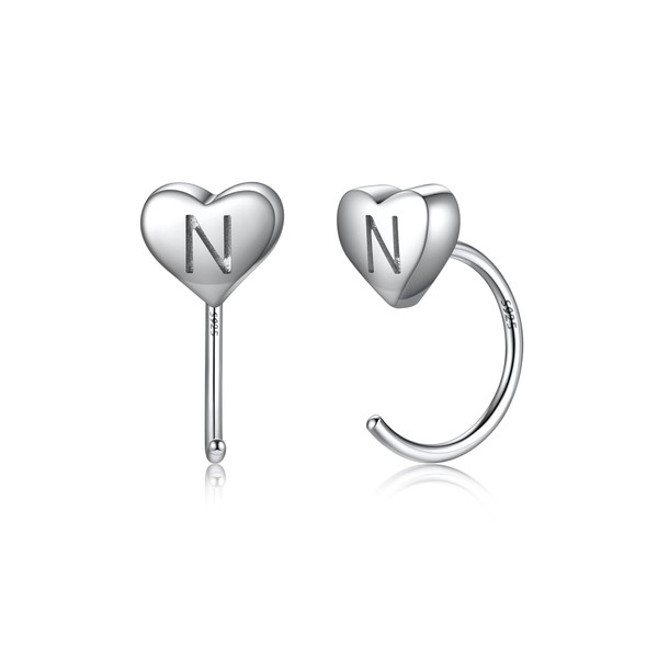 Sterling Silver Huggie Earrings with Initial N, Silver Heart Hoops, Dainty Small Letter Earrings for Women