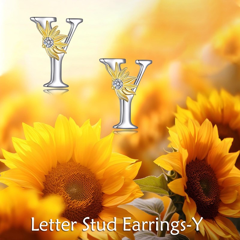 Sterling Silver Initial Alphabet Letter Script Name Earrings Sunflower Initial Studs for Women (Initial Y)