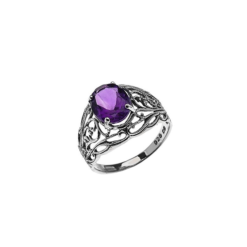 Sterling Silver Modern Filigree Design Genuine Amethyst Ladies Ring(Size 7)