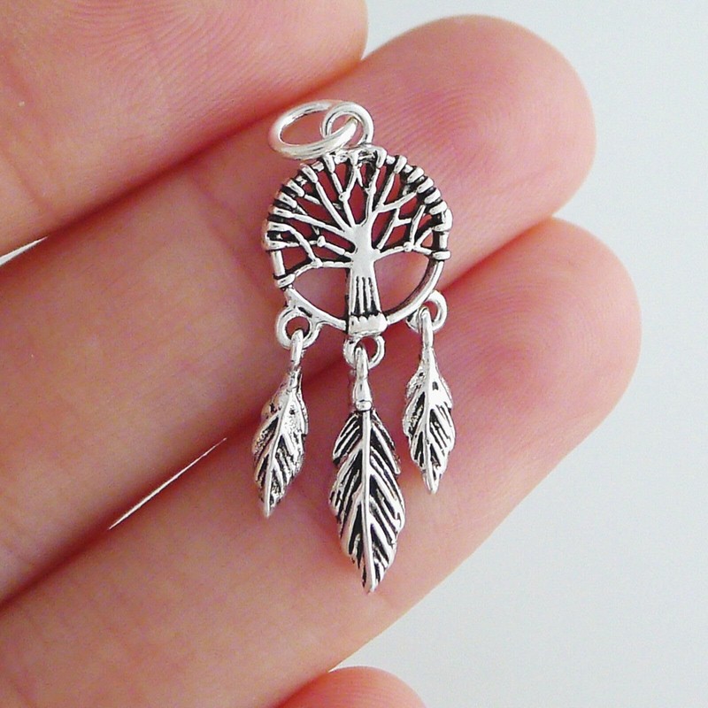Sterling Silver Oxidized Dream Catcher Tree of Life Angel Wing Feather Drop Charm Pendant