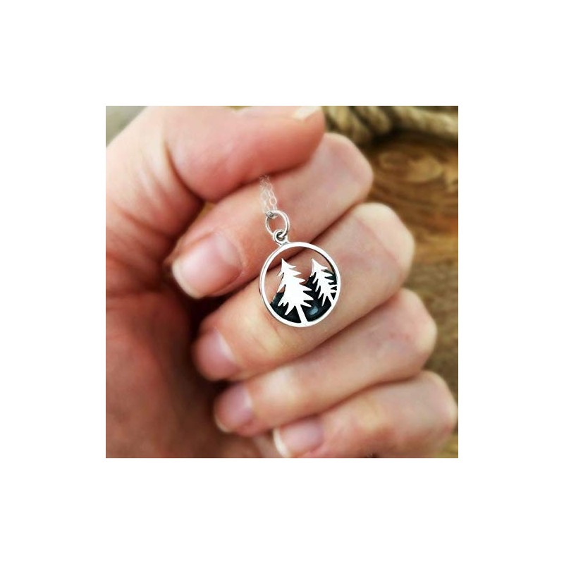 Pine Tree Necklace. This sterling silver necklace features two tall pine trees with mountains in the background. Go to the trees... adventure awaits! This pine tree necklace would be a great gift for a hiker, camper, nature lover, or anyone who loves the outdoors.