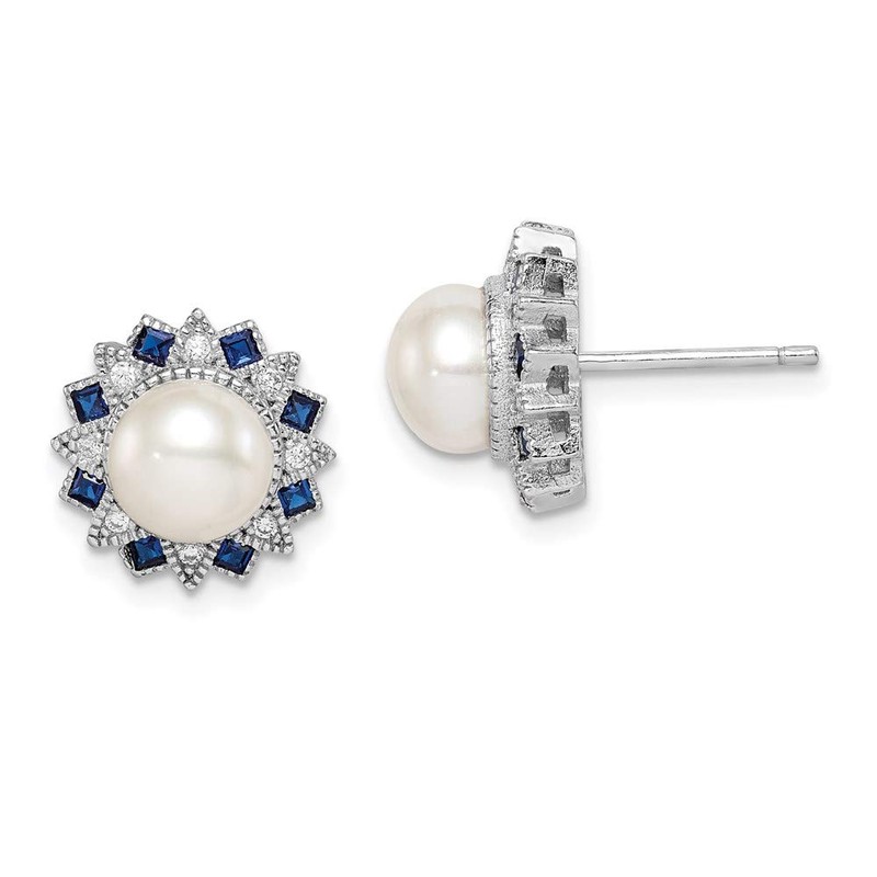 - Sterling Silver Rhodium-plated FWC Pearl, Synthetic Blue Spinel & Cubic Zirconia Stud Earrings