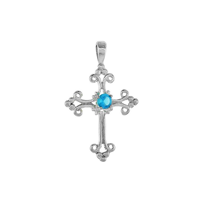 Sterling Silver Turquoise Cubic Zirconia Fleury Cross Pendant, 1 inch Long