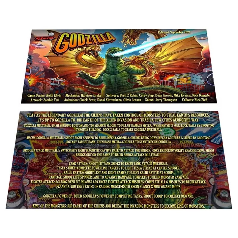 Stern Godzilla Premium Pinball Custom Apron Instruction Cards